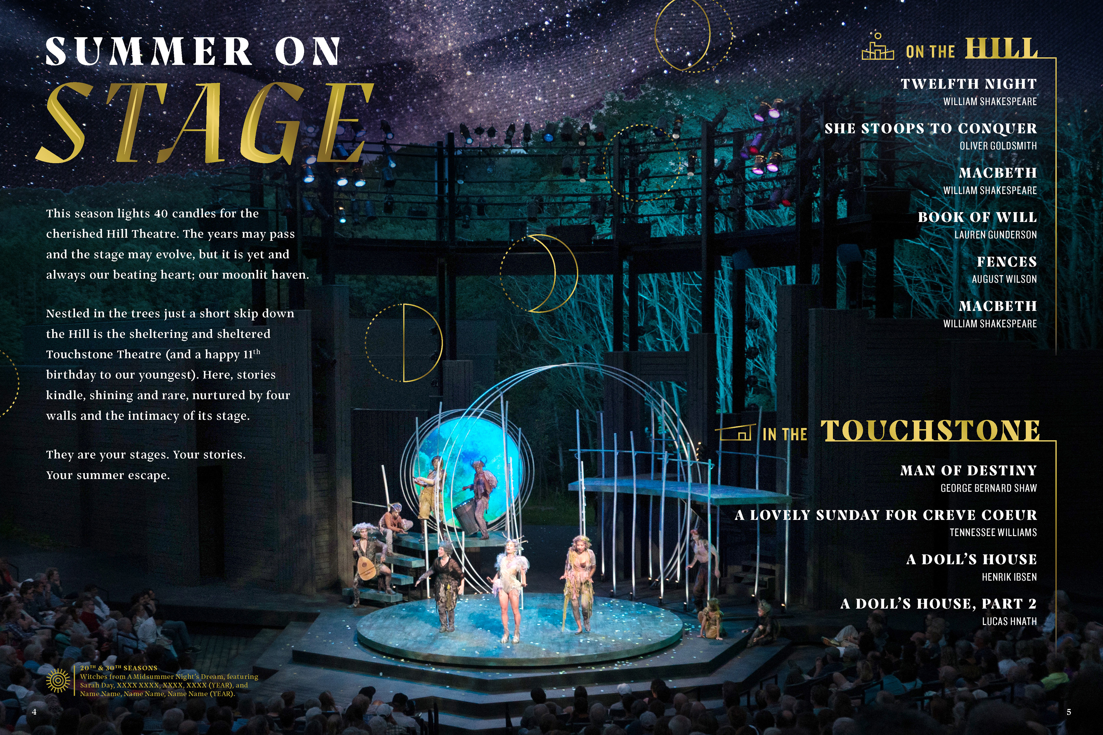American Players Theatre is a world-class theater located in the woods in the heart of the Driftless in Spring Green, WI. 2019 marked their 40th Anniversary year. Illustration and spread design for the 2019 Book of Summer.